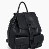 - Exterior: 2 front pockets with magnetic snaps and faux buckles, 1 back slip pocket with magnetic snap